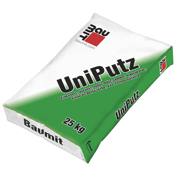 Baumit UniPutz vakolat – 25 kg – univerzális mész-cement vakolat kézi bedolgozásra – mindenféle alapra – kül- és beltéri felhasználásra – alap- és simítóvakolatkén
