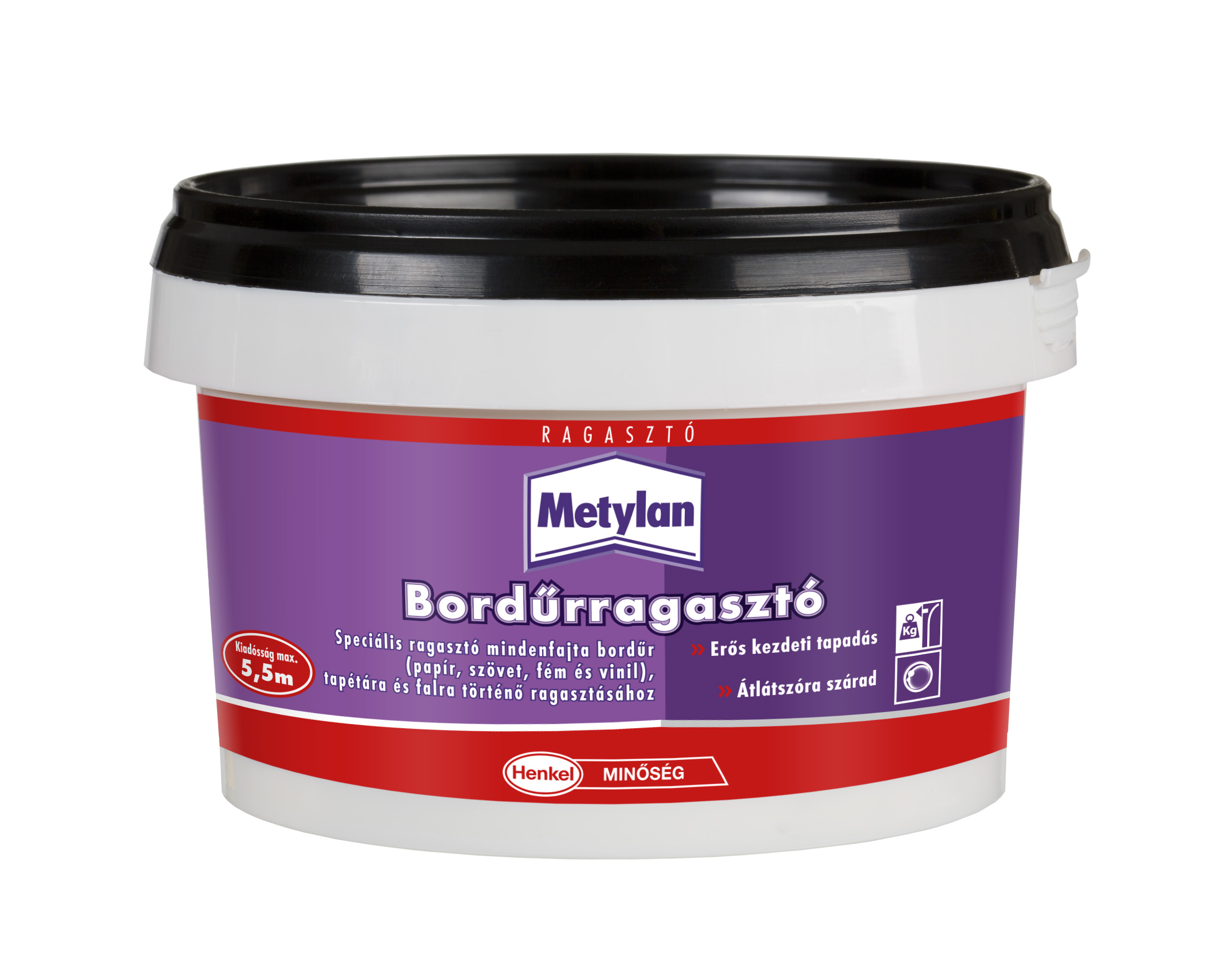 Felhasználásra kész, speciális ragasztó – a legkülönbözõbb anyagból készült – bordûr csíkok ragasztására. Javasolt vinil szegélycsík ragasztására vinyl tapétára. Tapéta illesztések javítására is kivállóan alkalmas. Könnyen felhordható és igazítható.