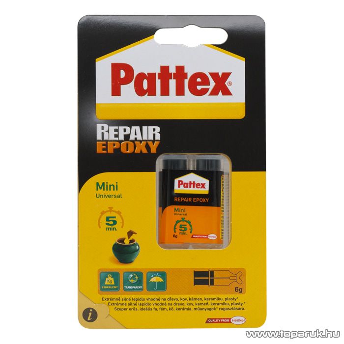 A Pattex Repair Universal epoxi ragasztót erős kötéshez ajánljuk, mivel 5 perc alatt megköt, így marad ideje a teljes megkötés előtti igazításhoz.